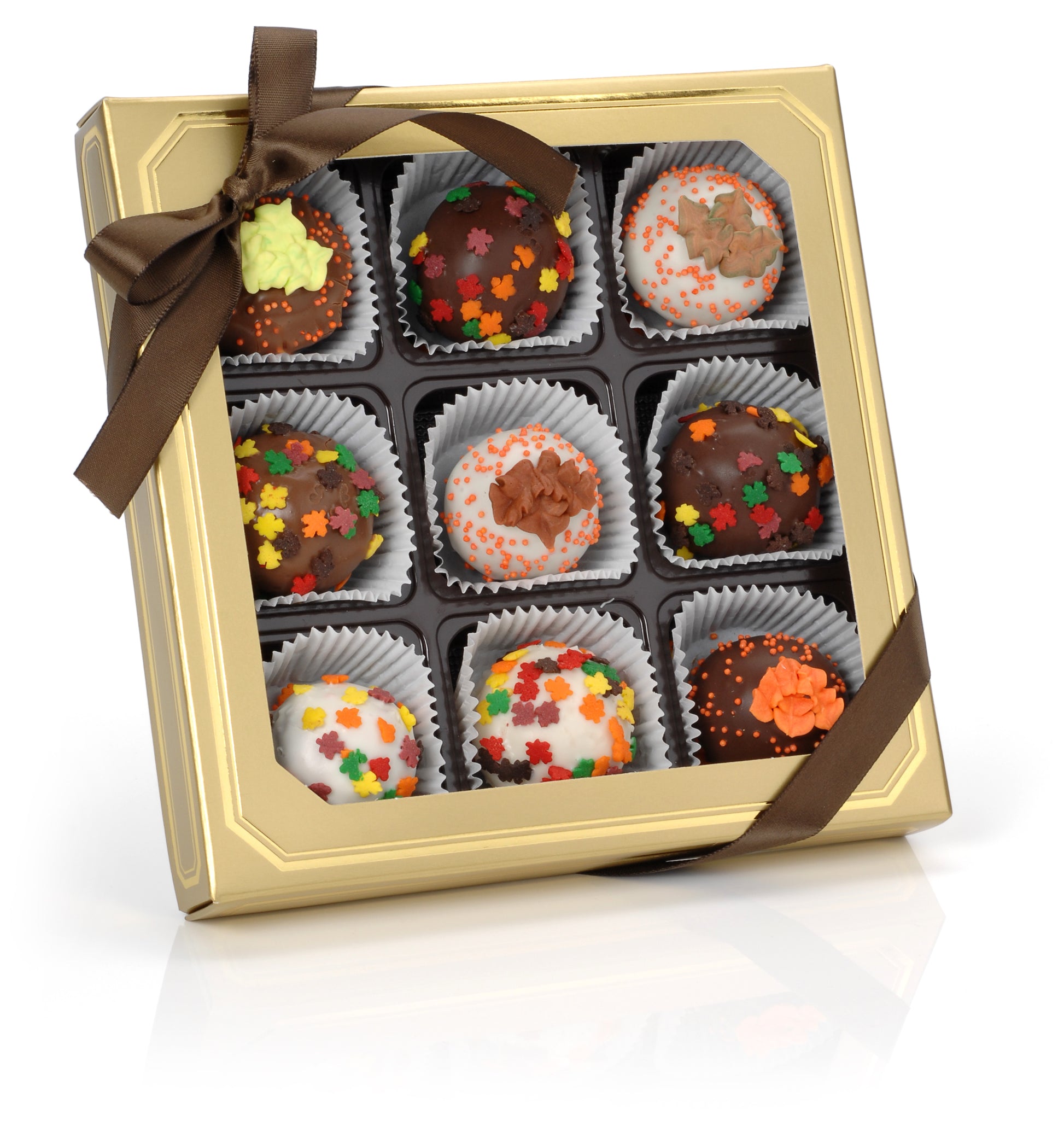 +1 818.993.1277Indulge in a unique gourmet experience with our Autumn Leaves Belgian Truffle Cake Bons. Hand crafted with the finest ingredients, our truffle cakes are made from fresh baked cake mixed with creamy icing and dipped in your choice of Belgian chocolates. Presented in an elegant gold gift box, this is the perfect treat for yourself or a loved one.