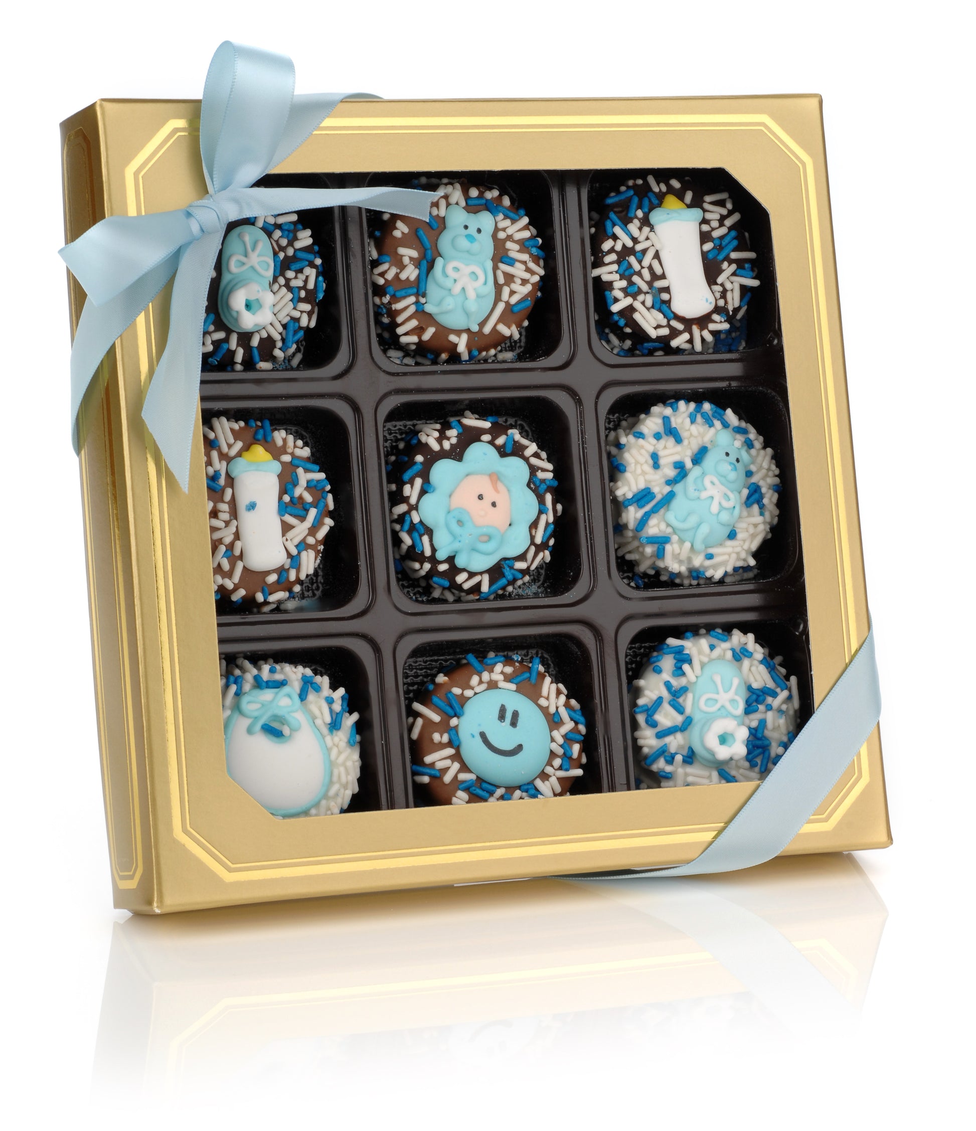 Indulge in the timeless charm of Lady Fortunes’ Baby Boy Chocolate Hand Dipped Sandwich Cookies! Each Chocolate Creme Sandwich Cookie is meticulously hand-dipped by our skilled artisans in your choice of premium chocolates—dark, milk, or white.