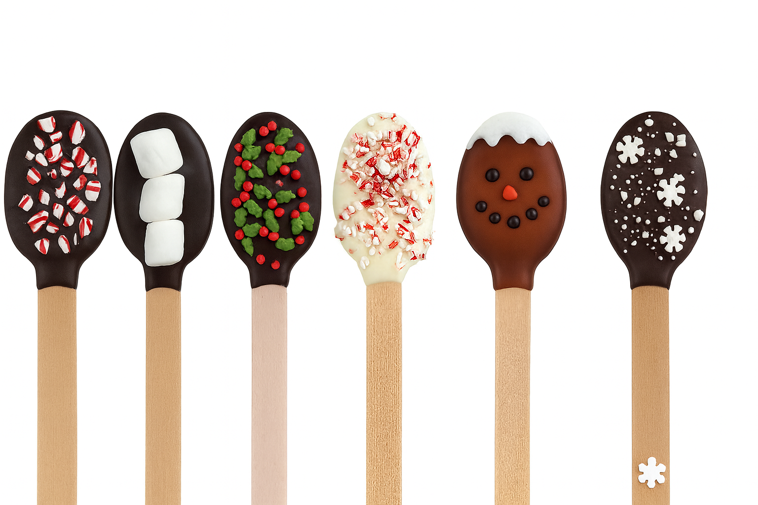 Stir up something magical! Our Chocolate Stirring Spoons are the sweetest way to upgrade your favorite hot cocoa, coffee, or warm winter drink. Each spoon is hand-dipped in premium chocolate—silky dark, creamy milk, or luscious white—then decorated with festive holiday toppings like crushed peppermint, mini marshmallows, holly berry sprinkles, whimsical snowflakes, and cheerful gingerbread faces.