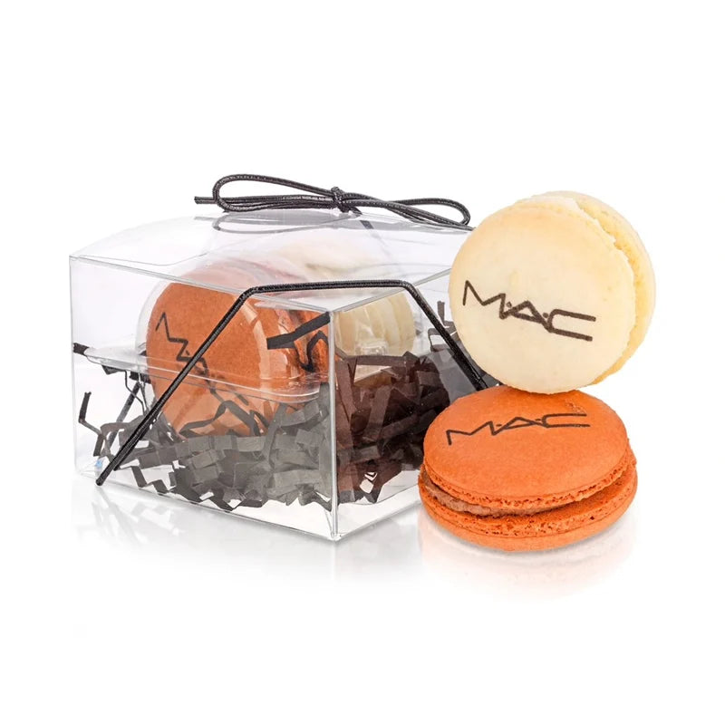 Encased in a crystal-clear acetate gift box (2 11/16" x 1 15/16" x 3 1/4") with a thermoform insert to protect their delicate shells, these macarons are as beautiful as they are delicious.