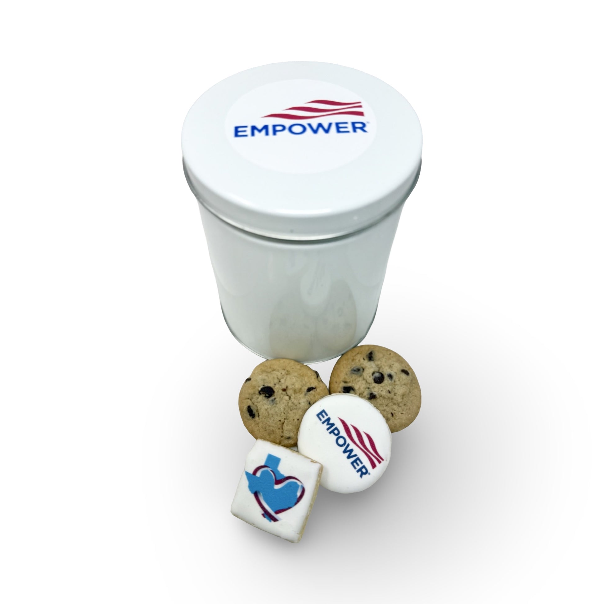 All cookies are hand-packed in our glossy enamel cylinder tin (4" diameter x 5" tall) and finished with a custom full-color Empower label on the lid. It's polished, professional, and delicious—ideal for corporate gifting, events, or as a thoughtful gesture to celebrate sweet success.