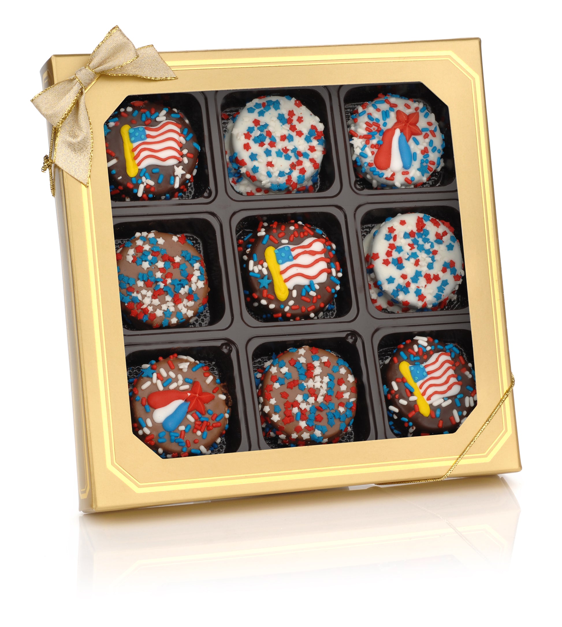 Indulge in the timeless charm of Lady Fortunes’ Fourth of July Chocolate Hand Dipped Sandwich Cookies! Each Chocolate Creme Sandwich Cookie is meticulously hand-dipped by our skilled artisans in your choice of premium chocolates—dark, milk, or white.