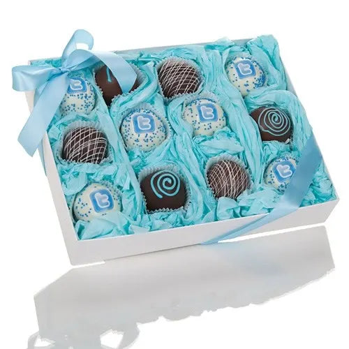 +1 818.993.1277Bring a unique touch to your gifting with our Logo Truffle Bon Bon-Box of 12! Your custom artwork, whether it's your logo or a photo, is printed in edible ink on our Edible Appliqués(TM) and applied to our delicious Cake Truffles. Choose your own non pariels for a colorful addition.