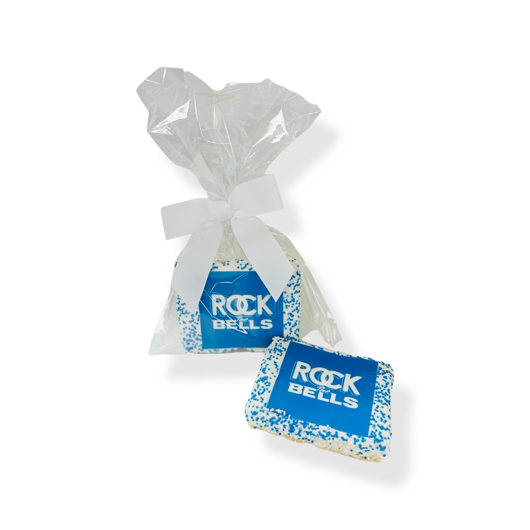 Our Large Rice Crispy Squares are a bold blend of nostalgic flavor and personalized flair. Each handcrafted 3" x 3" treat is dipped in rich chocolate and framed with your choice of vibrant sprinkle colors, creating a stunning picture-perfect border. Topped with a vibrant edible sugar sheet printed in vivid edible inks featuring your photo, logo, or design, precisely cut to fit, these chewy, marshmallow-packed squares are perfect for standout party favors, branded giveaways, or unforgettable personalized gifts. Customize the sprinkle colors to match your vision and make every bite a masterpiece with these irresistible, chocolate-dipped treats!