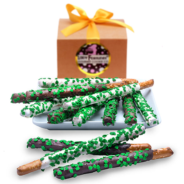 +1 818.993.1277Celebrate St. Patrick's Day with Lady Fortunes® Pretzel Wands—handcrafted pretzel rods dipped in luxurious Belgian chocolate in milk, dark, or white. Decorated with colorful sprinkles and festive confections, each wand arrives individually wrapped and beautifully presented in a premium brown matte gift box with ribbon and metallic label. Perfect for holiday parties, corporate gifts, or adding a touch of gourmet charm to your St. Patrick's Day festivities.