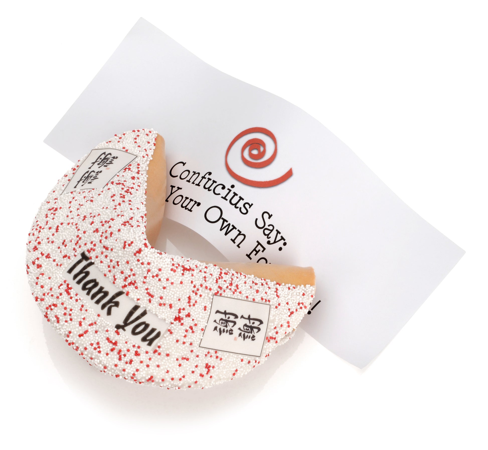 Express your gratitude in the sweetest way with our Thank You Giant Fortune Cookie! This handmade, colossal vanilla fortune cookie is dipped in luscious white chocolate—and adorned with the heartfelt message "Thank You" printed in both English and Chinese on fine sugar sheets. To add an extra touch of sweetness, it’s finished with red and white nonpareil sprinkles for a festive and vibrant look.